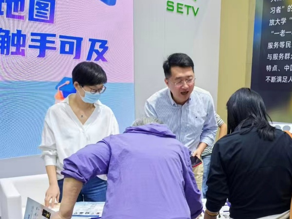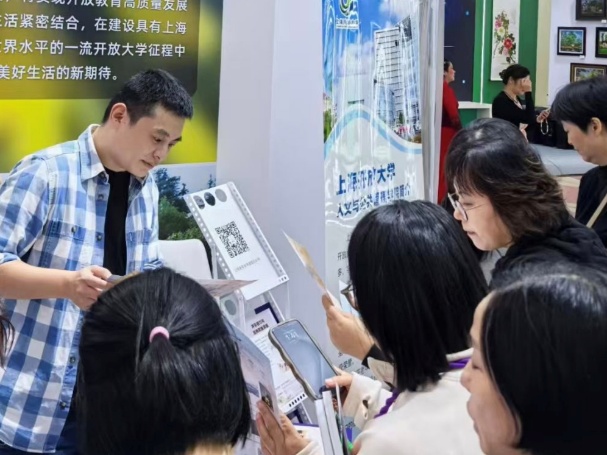 学院展台也成为展会的“热门打卡点”。展台大屏幕循环滚动播放学院老年大学课程授课视频、智慧美育空间教学展演视频及 AI 短训班学员作品,直观展现学院在老年教育领域的教学实践与成果。展台前人头攒动,参展观众或认真翻阅课程资料,或向工作人员咨询课程报名方式,工作人员耐心解答每一个疑问,让“优质老年教育资源”真正触达有需求的群体。