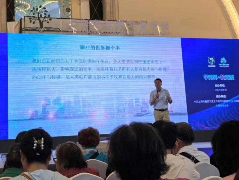 直播间外,学院的《AI视频制作》体验课同样热度爆棚。课程开设于展厅一楼主舞台,140 个坐席被“银龄学霸” 早早抢空,现场座无虚席。学院艺术学科带头人吴春集教授以浅显易懂的语言拆解 AI 工具操作步骤,带领老年学员现场体验视频制作。他还展示了学院 AI 视频制作短训班学员的优秀作品,一幅幅生动的视频画面赢得观众阵阵好评。许多老年人首次接触 AI视频制作,兴趣浓厚、上手迅速,课程结束后仍围着吴教授追问操作细节,迟迟不愿离开。