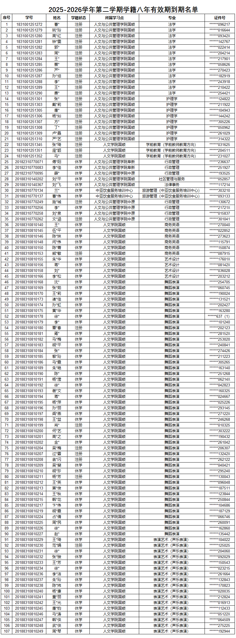 2026年3月1日起为上海开放大学2025-2026学年第二学期,特友情提醒下列学员的学籍有效期即将到期,2025-2026学年第二学期是最后一个学期。望广大学员自行组织好学习安排并按时提交申报材料,以免错过毕业申请、学位申请等重要时间节点。特此提醒! 附件: 2025-2026学年第二学期学籍八年有效期到期名单 上海开放大学人文与公共管理学院2025年11月