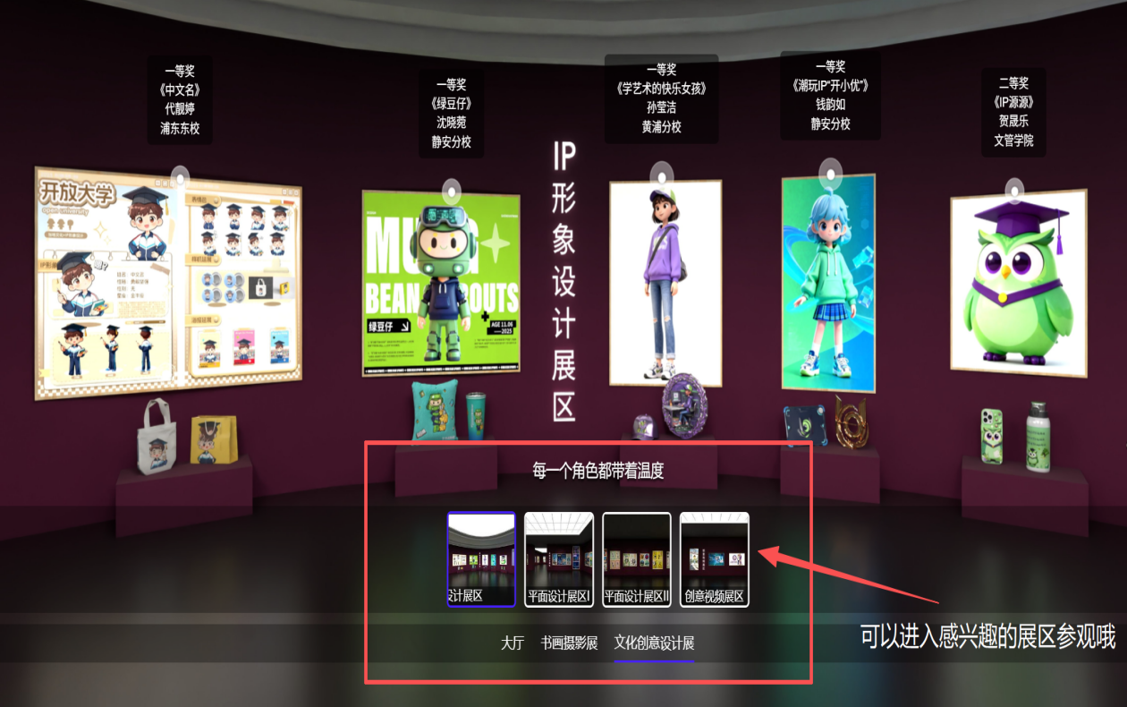 “艺术云展厅”分为“学在开大 设计未来”文化创意设计展厅和“学在开大 墨韵光影”书画摄影作品两个展厅。文化创意设计展厅包括:创意视频、平面设计、IP形象设计三个板块。书画摄影展厅包括:书法、绘画、摄影三个板块。