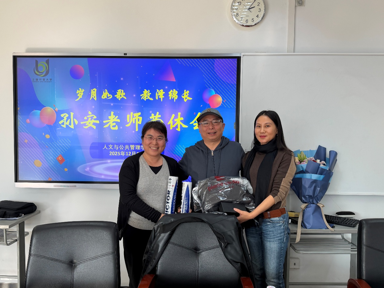冬日暖阳,温情满堂。2025年12月5日下午,上海开放大学学习广场 320 会议室里暖意融融,一场以“岁月如歌,教泽绵长”为主题的荣休会在此温情举行。人文与公共管理学院党政领导、校工会代表、学院部分教师及外语系全体成员齐聚一堂,共同送别在教育一线辛勤耕耘 37 载、在上海开放大学倾情奉献 29 年的孙安老师,见证其教育生涯的圆满功成,祝愿他开启人生崭新篇章。本次荣休会由外语系党支部书记沈翠萍主持。