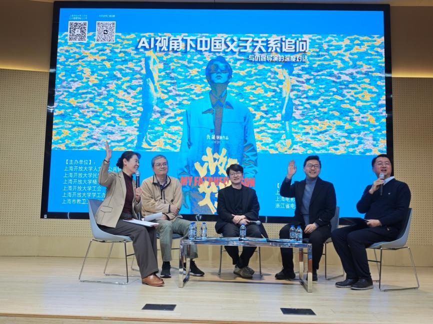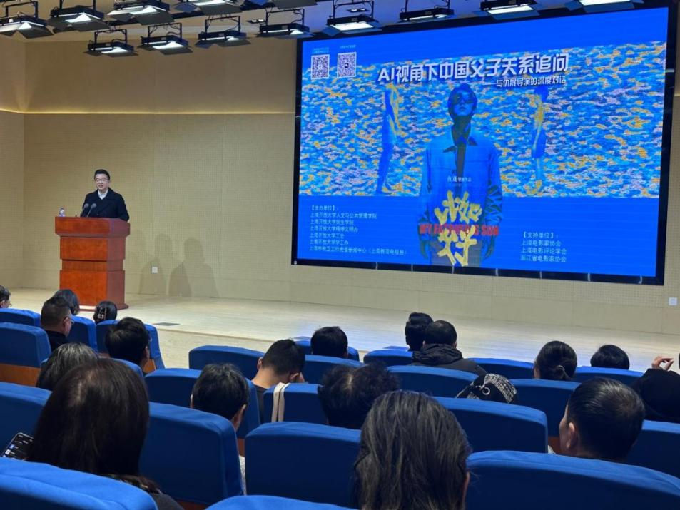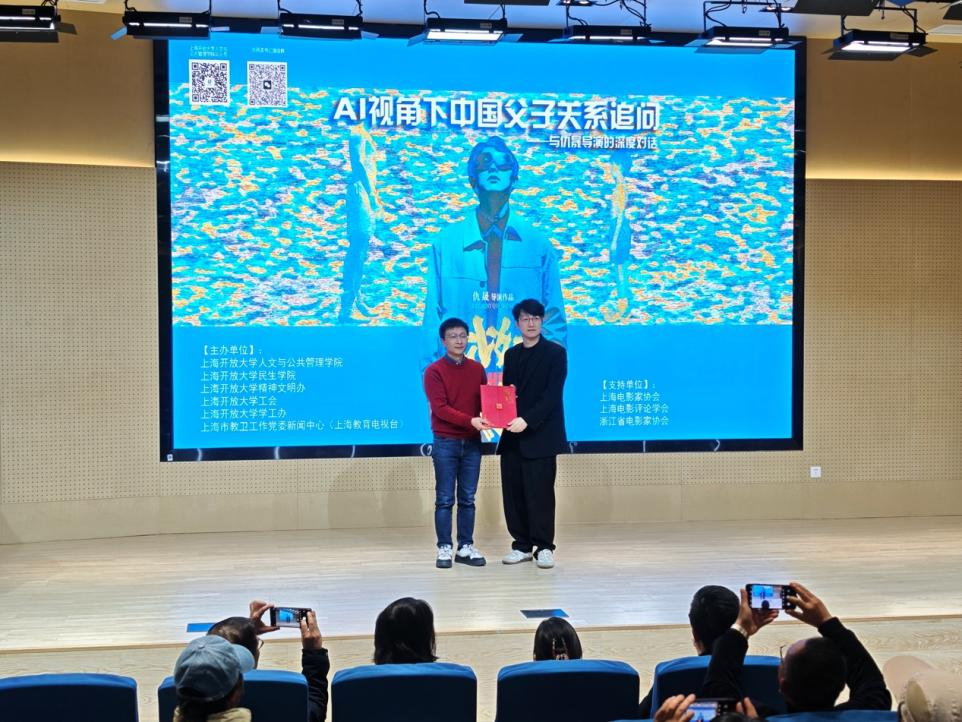 12月12日下午,上海开放大学国际会议中心演讲厅内高朋满座,一场以“AI视角下中国父子关系追问”为主题的观影对话活动在这里举行。100多位师生、市民与来自上海电影家协会的行业专家齐聚一堂,共同热议父子亲情话题。上海开放大学党委副书记、副校长孙向彤出席活动并致辞。活动现场,第二十七届上海国际电影节金爵奖主竞赛单元艺术贡献奖影片《比如父子》的导演仇晟获聘为上海开放大学行业导师,并与来自教育学、社会学、法学、电影评论等领域的专家学者展开深度对谈,共同探讨在科技与人文交汇处,中国父子关系的当代表达与深层命题。当被问及希望通过影片给为人父母者哪些建议时,仇晟表示,希望更多家长能蹲下身子“平视”孩子,与孩子平等对话,给予他们更多尊重和关爱。