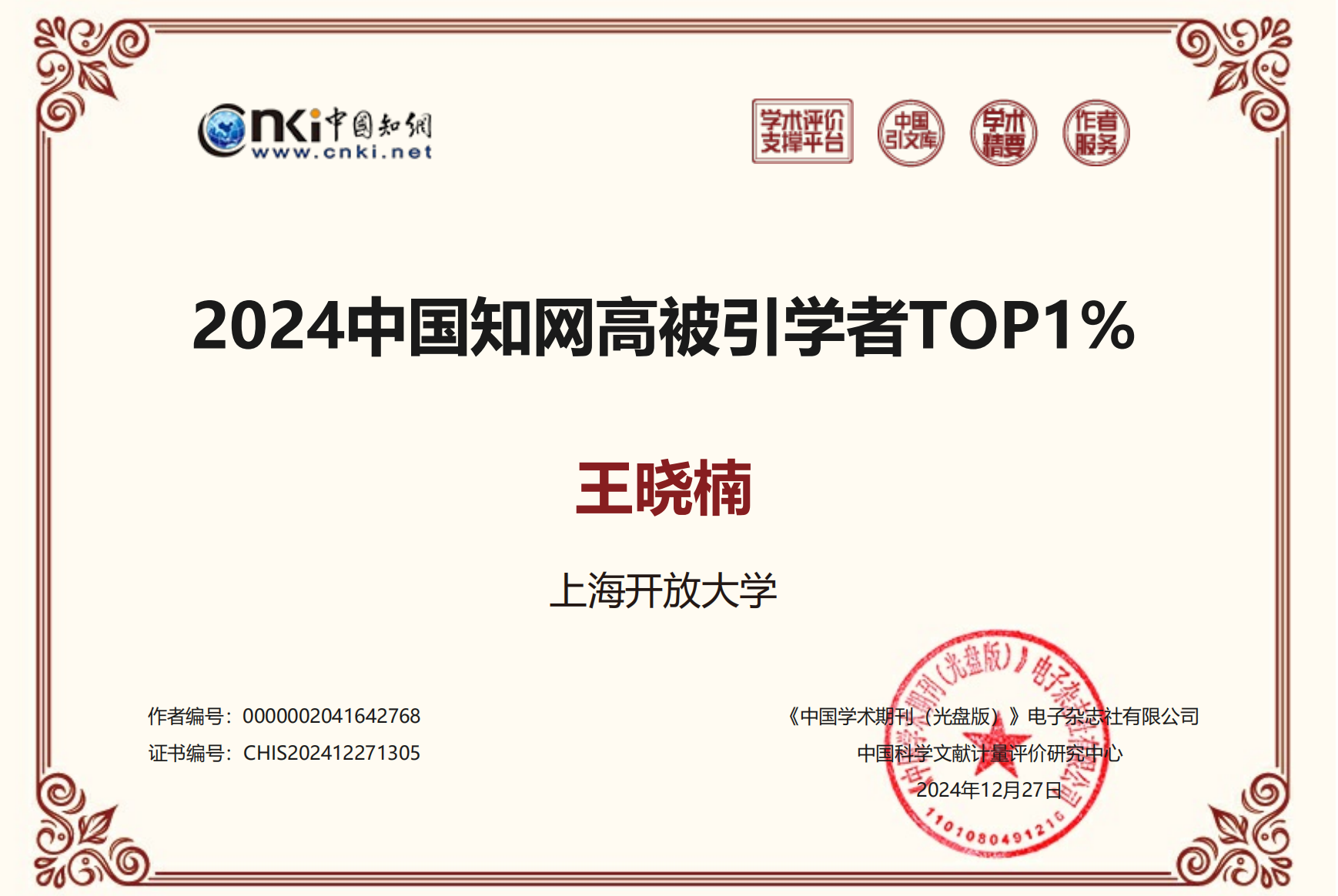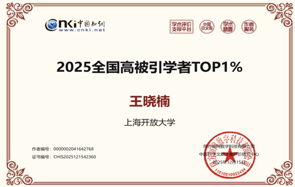 2025年12月12日,中国知网下属的中国科学文献计量评价研究中心(出版智库)发布“2025全国高被引学者”榜单。本年度发布的“2025全国高被引学者”约12万人,其中TOP1%学者约3万人,TOP5%学者约9万人。我院王晓楠继去年入选社会学学科“2024年中国高被引学者TOP1%”榜单后,今年又入选社会学学科“2025年中国高被引学者TOP1%”榜单。