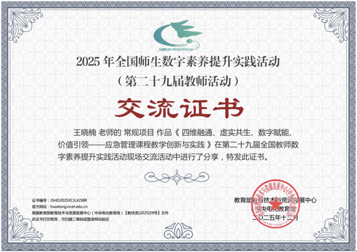 近日,由教育部教育技术与资源发展中心主办的2025年全国师生数字素养提升实践活动(第二十九届教师活动)现场交流活动在福建泉州圆满举行。我院王晓楠报送的《四维融通、虚实共生、数字赋能、价值引领——“应急管理”智慧课程教学创新与实践》课程案例,入围高等教育组信息化教学课程案例现场展示交流环节。