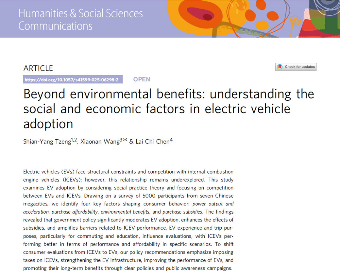 近日,我院王晓楠教授相关成果以“Beyond environmental benefits: understanding the social and economic factors in electric vehicle adoption”,(超越环境效益:理解电动汽车采纳的社会与经济因素)为题,发表在Nature旗下唯一的人文社会学科类子刊《Humanities and Social Sciences Communications》。该论文是王晓楠教授(通讯作者)与泉州信息工程学院经济与管理学院学曾宪扬教授(第一作者)等共同合作成果。