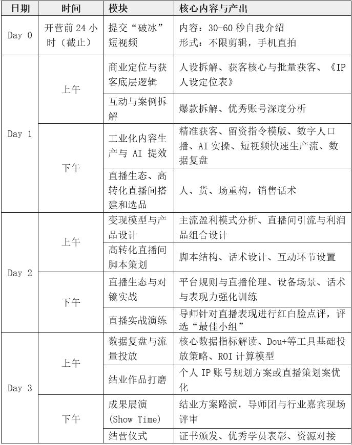 课程深度融合内容复利思维与短视频、AI数字人、直播带货等前沿工具,通过三天高强度、全实战的沉浸式训练,帮助学员快速构建从IP定位、内容生产、流量获取到商业变现的完整能力闭环,为学员开辟职业新赛道。