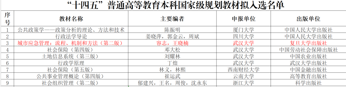 近日,教育部公示《“十四五”普通高等教育本科国家级规划教材拟入选名单》。由我院王晓楠教授联合主编,我校多位骨干教师参与编写的《城市应急管理:流程、机制和方法(第二版)》成功入选!这标志着上海开放大学在国家级高水平精品教材建设领域取得重大突破,彰显了我院在服务国家超大城市治理战略和应急管理人才培养方面的办学实力,也为学校深化内涵建设增添了标志性成果。