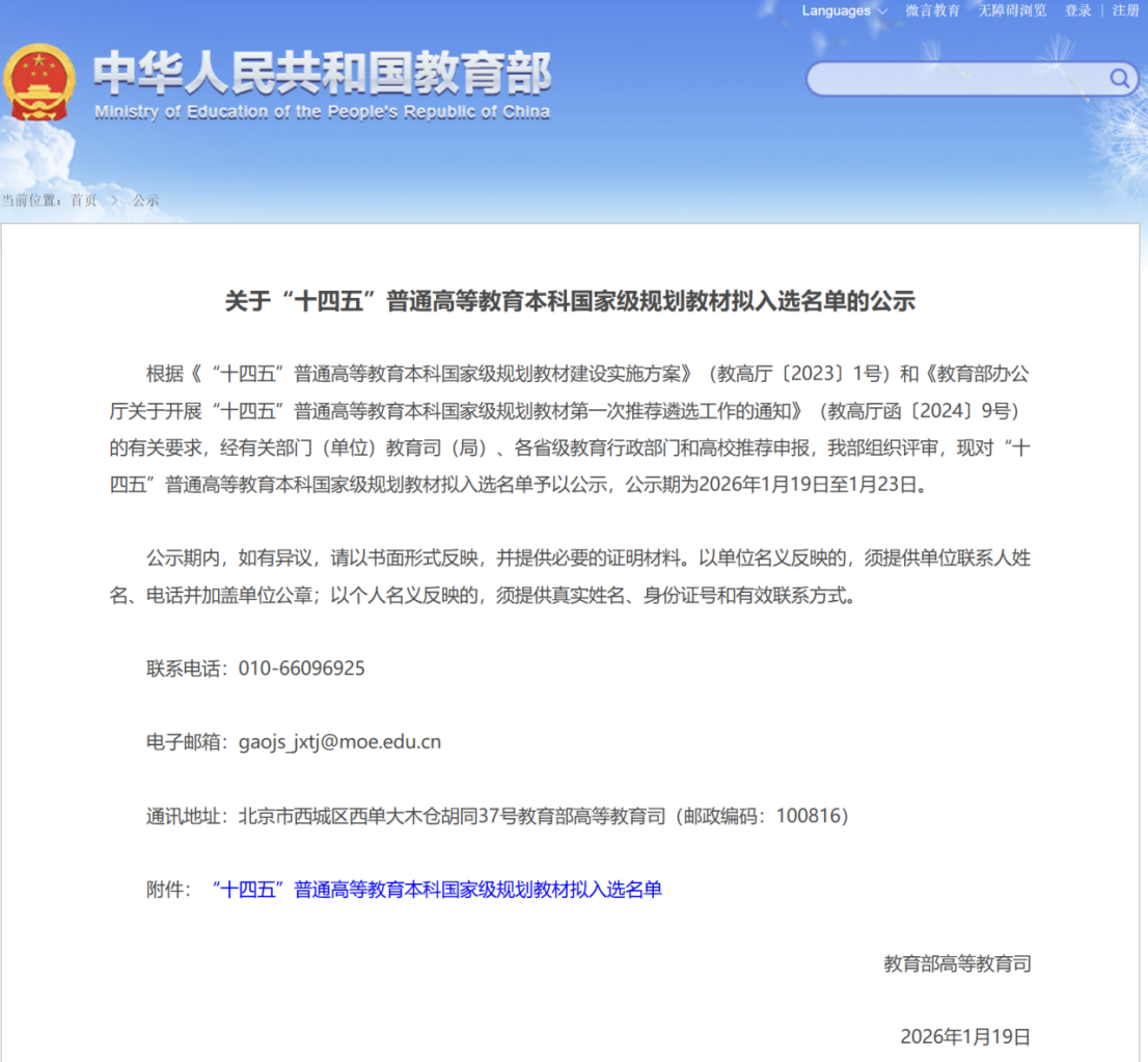 “十四五”国家级规划教材遴选旨在打造代表国家水平、契合教学改革的高质量本科教材。本次全国共拟入选3404项,竞争尤为激烈。近年来,在学校的统一部署和大力支持下,我院高度重视教材建设,落实立德树人根本任务,鼓励教师紧跟学术前沿,将科研成果、数字化战略与教学深度融合,着力打造具有时代特征的精品教材。