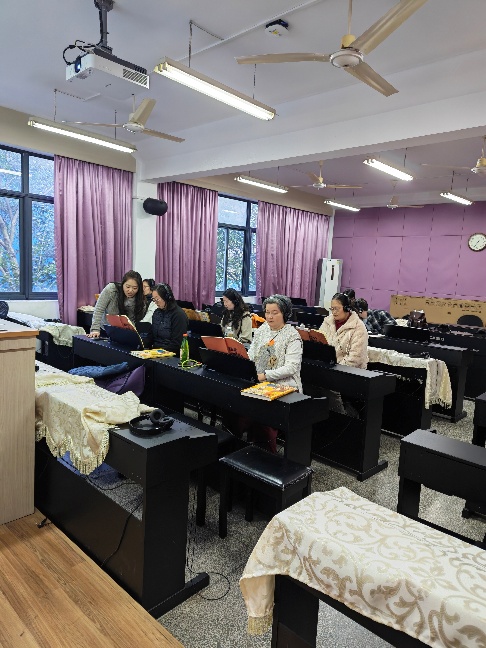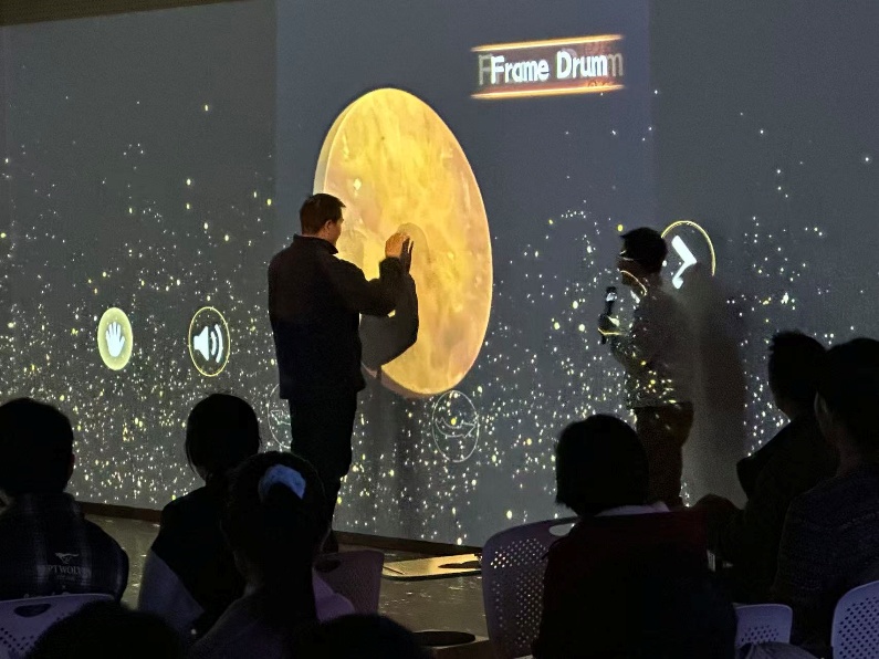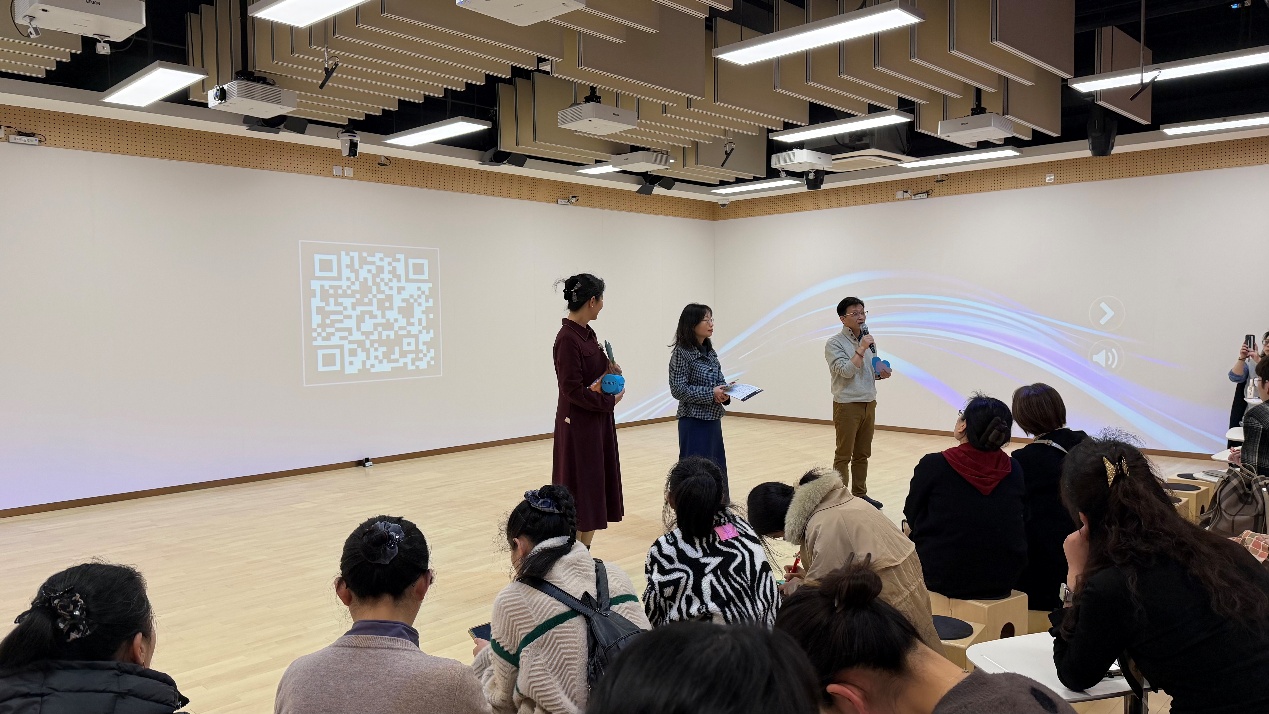 下午2点,活动进入“探访未来学习空间”环节。在冯毅副院长的主持下,参与者们走进了学院极具时代感与科技感的美育智慧空间。这里不再是传统的教室,而是一个融合审美、科技与协作的创意场域。来宾们亲身体验了智慧声乐教学等展示,深刻感受到技术与艺术深度融合所带来的面向未来的教育可能。张晶老师全程参与、引领学员们一同参与节拍、合唱等环节的互动,并在互动后倾情介绍表演艺术专业的优势。总支书记林晓英评价道:“古典舞和智慧声乐教学展示针对性强,精彩纷呈,加上真实课堂的开放,让学员亲眼看到了老师们的实力。”