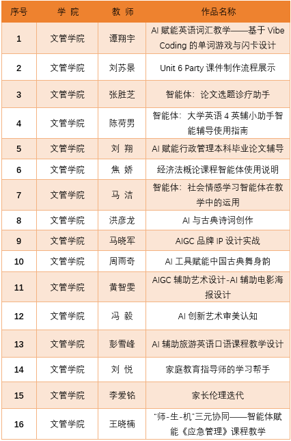 根据通知公布的优秀教学案例作品清单,全校共评选出优秀作品29件。其中,文管学院教师作品独占16项,占比超过55%,以显著优势领跑全校,充分展现了学院在人工智能与教育教学融合创新领域的深厚积累与积极探索。